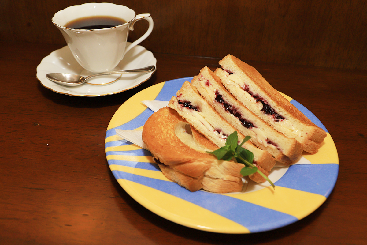 たっぷりのカマンベールチーズとブルーベリージャムを、サクサクのトーストでサンドした贅沢な一品で、カマンベールチーズの濃厚なコクとブルーベリージャムの甘酸っぱさがクセになる味わい。ブレンドコーヒーとの相性も抜群!