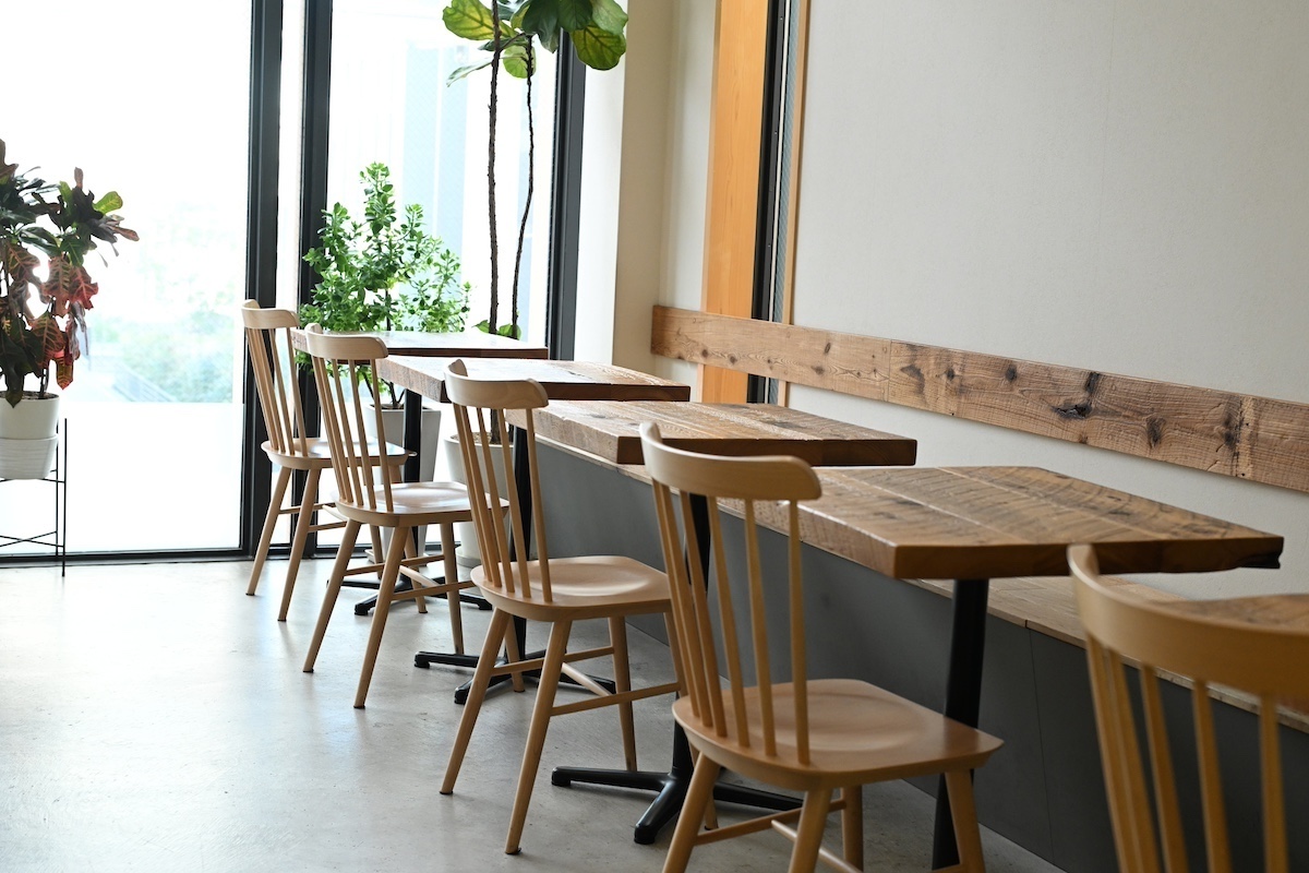 アーケード側に面した壁はガラスになっていて、明るく開放的な雰囲気。白壁や木の家具をメインに配置し、ナチュラルな店内に仕上がっているうえ、カウンターや二人がけの椅子を多く配置しているので、女性一人でも気軽に入れるのが嬉しいポイント!