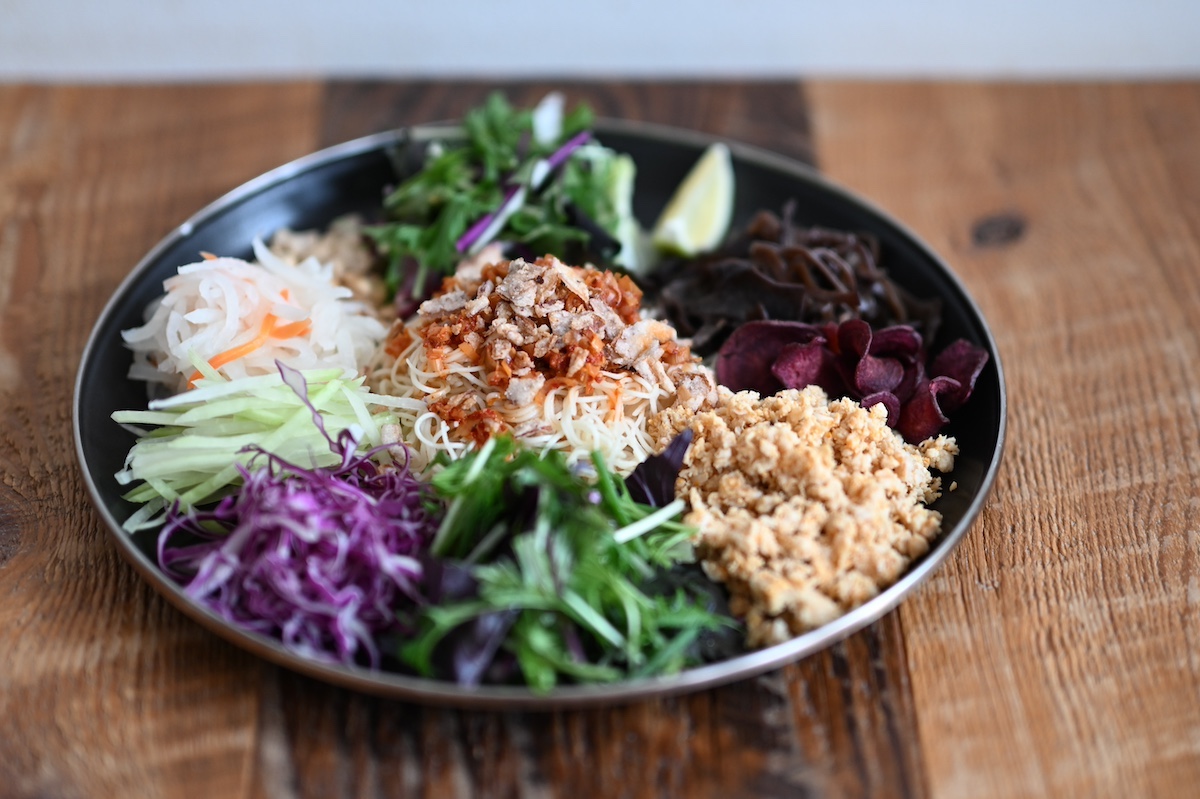 「四万十鶏そぼろと季節野菜のピリ辛和え麺」(1600円)は高知県産野菜の鮮やかさを全面に出したい!と、10種の素材を盛り込み、彩り・ボリューム共に満点の一皿に仕上がっている。