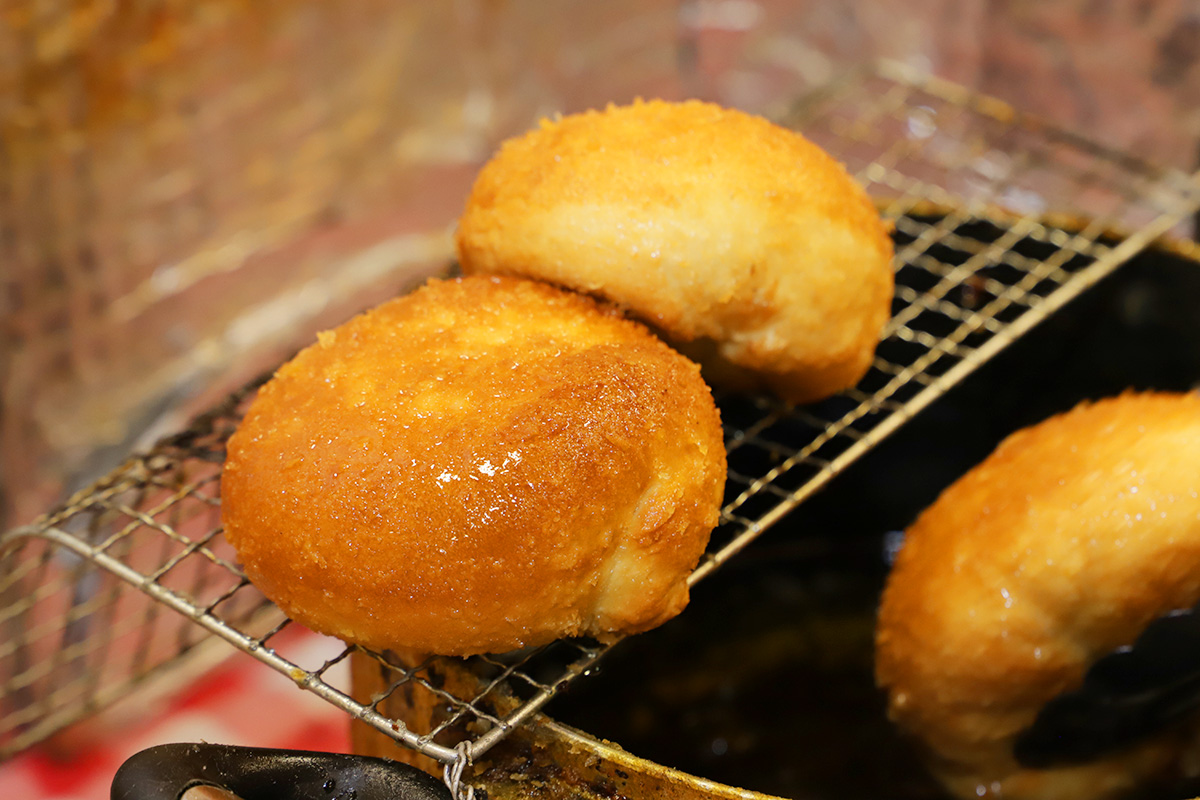カレーパンが次からつぎへと黄金色に揚がっていく様子にお客さんも釘付けに。この揚げたてのカレーパンを求めて買いに来る人もいるのだとか。