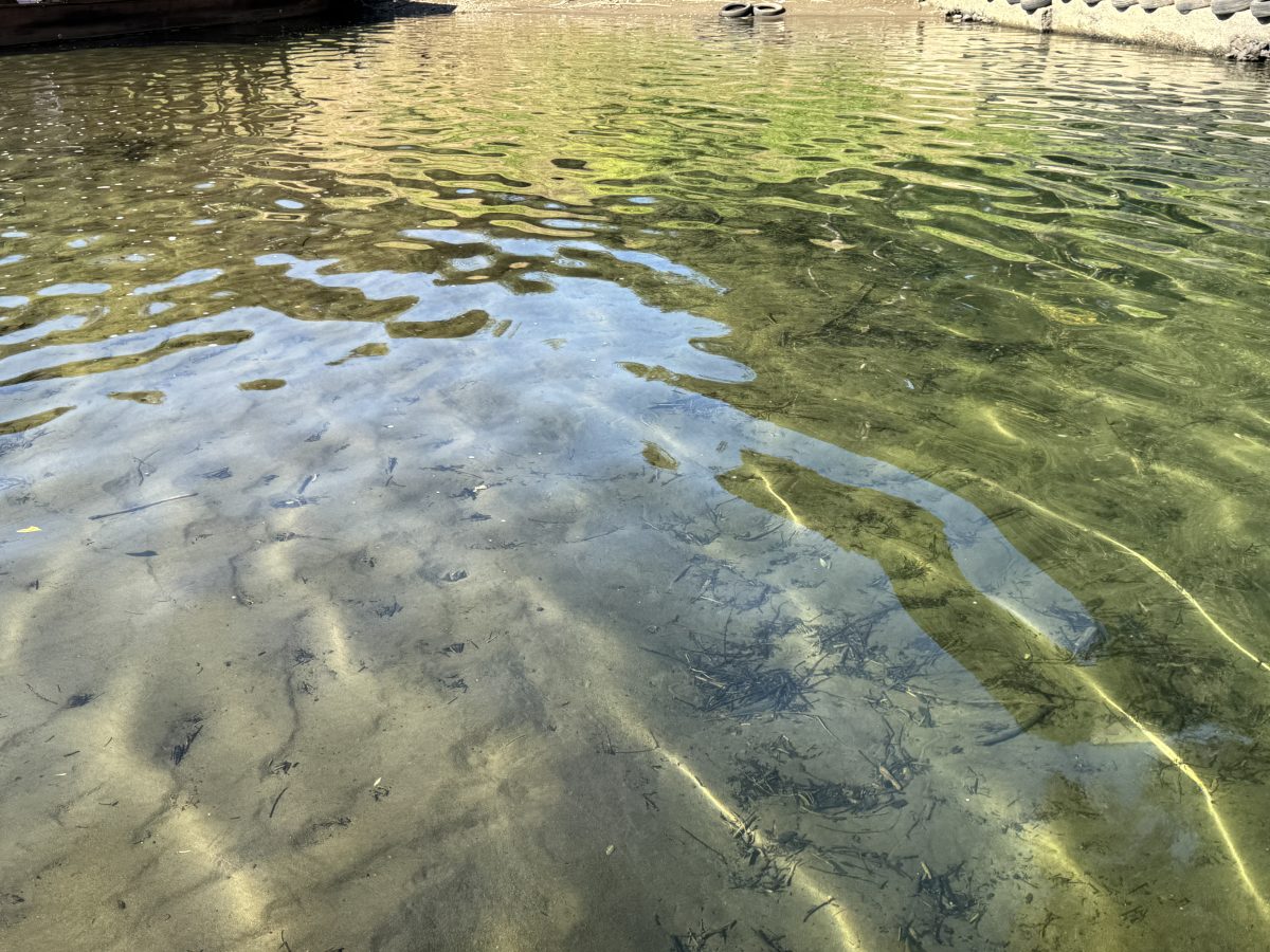 船が岸に近づくにつれて水深が浅くなり、川底の砂利や揺れる水草が驚くほど鮮明に浮かび上がります。