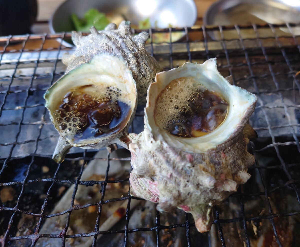 生簀から取り出した貝は鮮度がよく、「早く焼いてくれ」と言っている。
