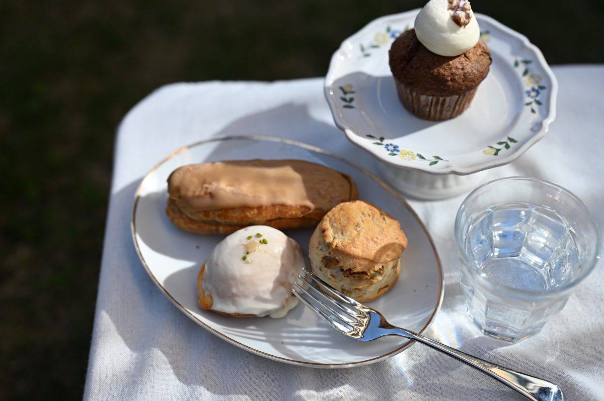 写真奥・コーヒー感がありながらも苦すぎない絶妙な塩梅で、甘いのが苦手な男性にも人気の一品「コーヒーエクレア」(400円)