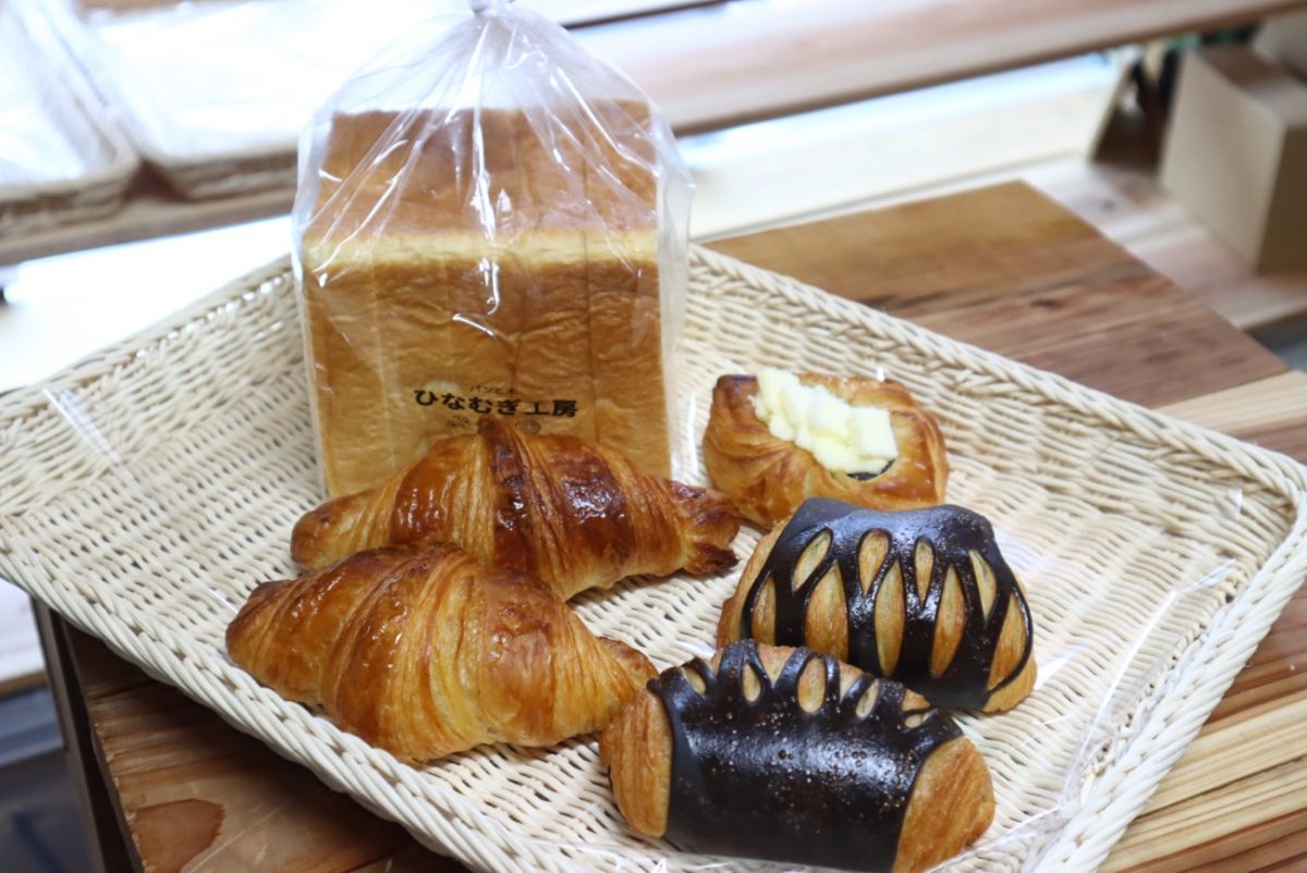写真は、ひなむぎ食パン、あんバター、クロワッサン、パン・オ・ショコラ。