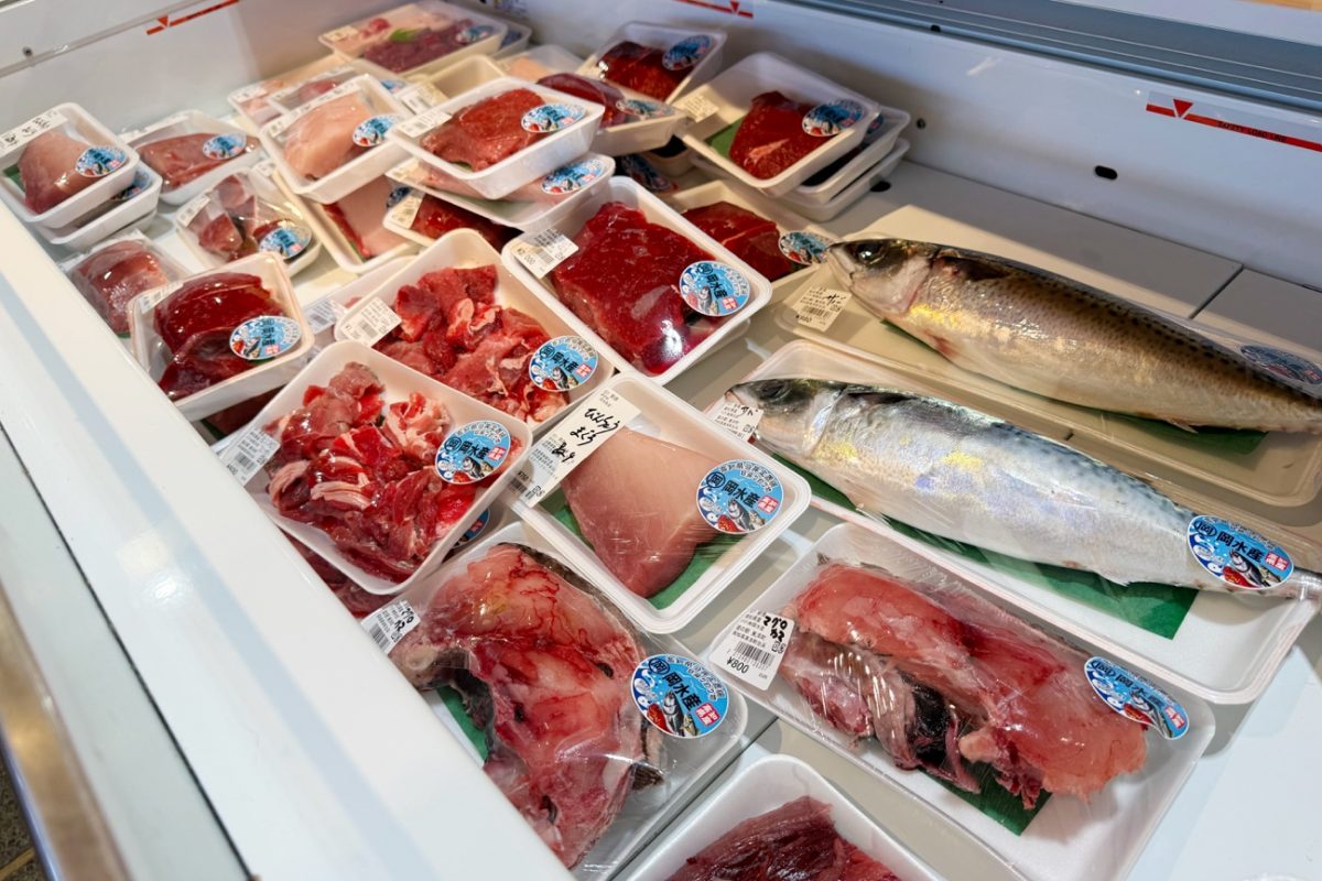 この日は、ビンチョウマグロ、クジラ、マグロ、サバなどが並んでいた。