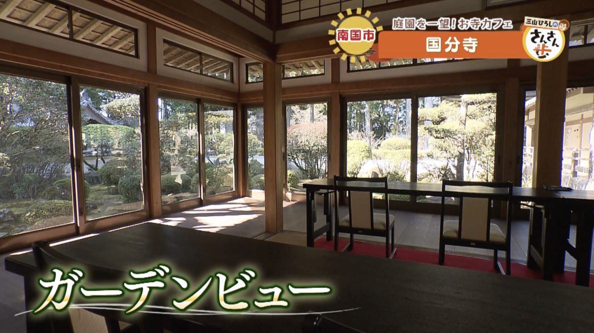 お寺カフェのある客殿は、庭園を望むガーデンビューで自然豊かな景色が広がる。