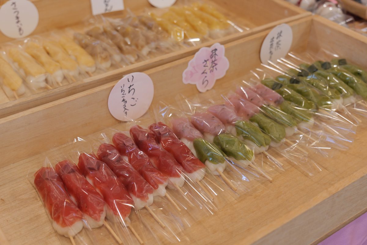 季節に合わせてラインナップが変わる、赤、黄、緑の彩り豊かな串団子。春が近づくと、お花見シーズンにぴったりな、桜をモチーフにした団子が並ぶ。