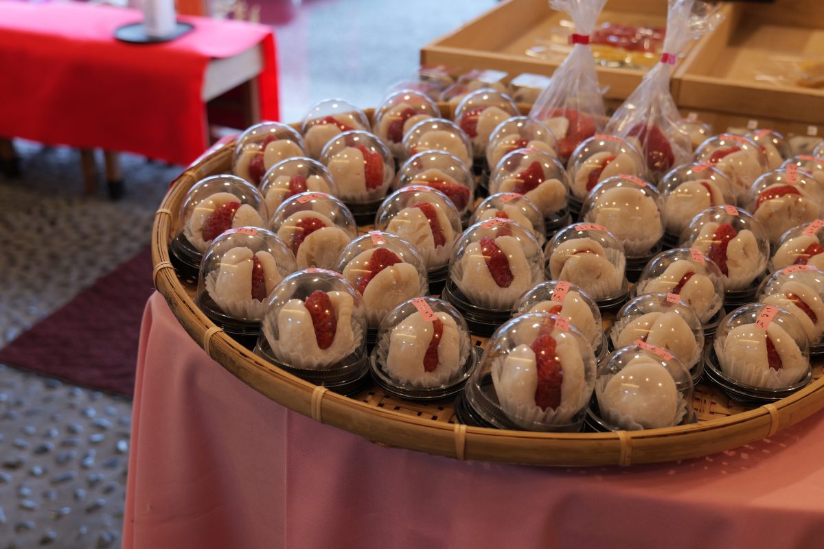 地元の食材を使った、四季を感じられる和菓子の中でも人気の商品、いちごの旬の季節に作る「いちご大福」です。あまおうを白あんで包み、ひょっこり顔を覗かせました。見た目も可愛く、甘酸っぱい味わいで、幅広い世代におすすめの商品です。