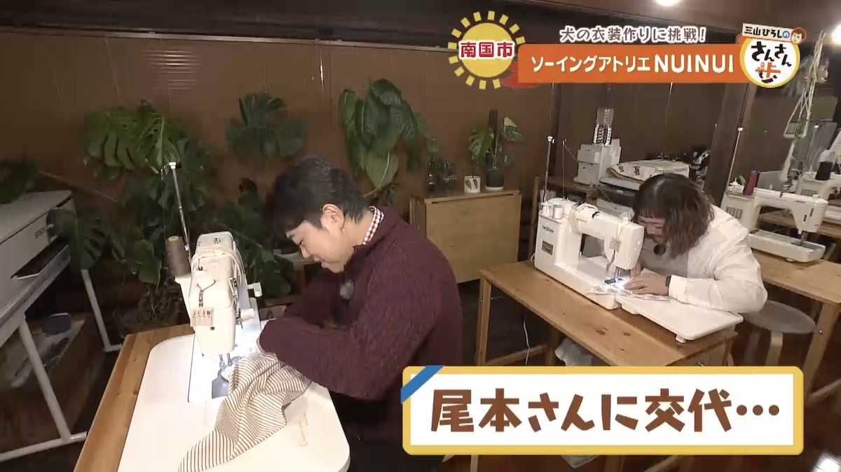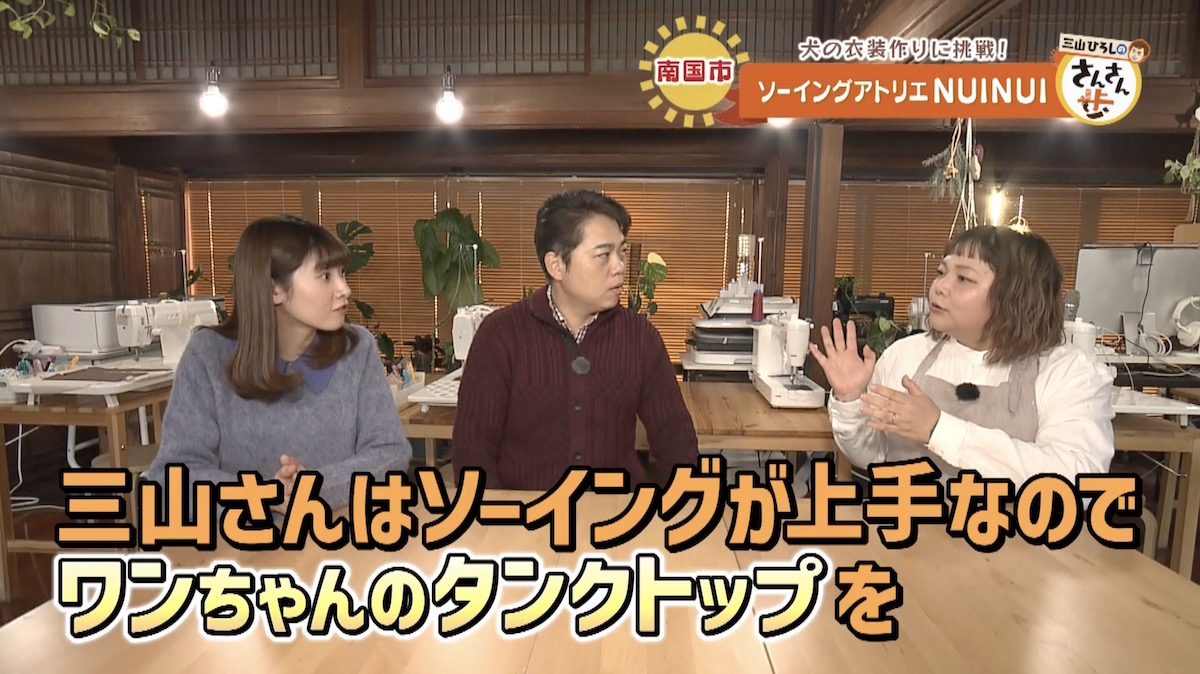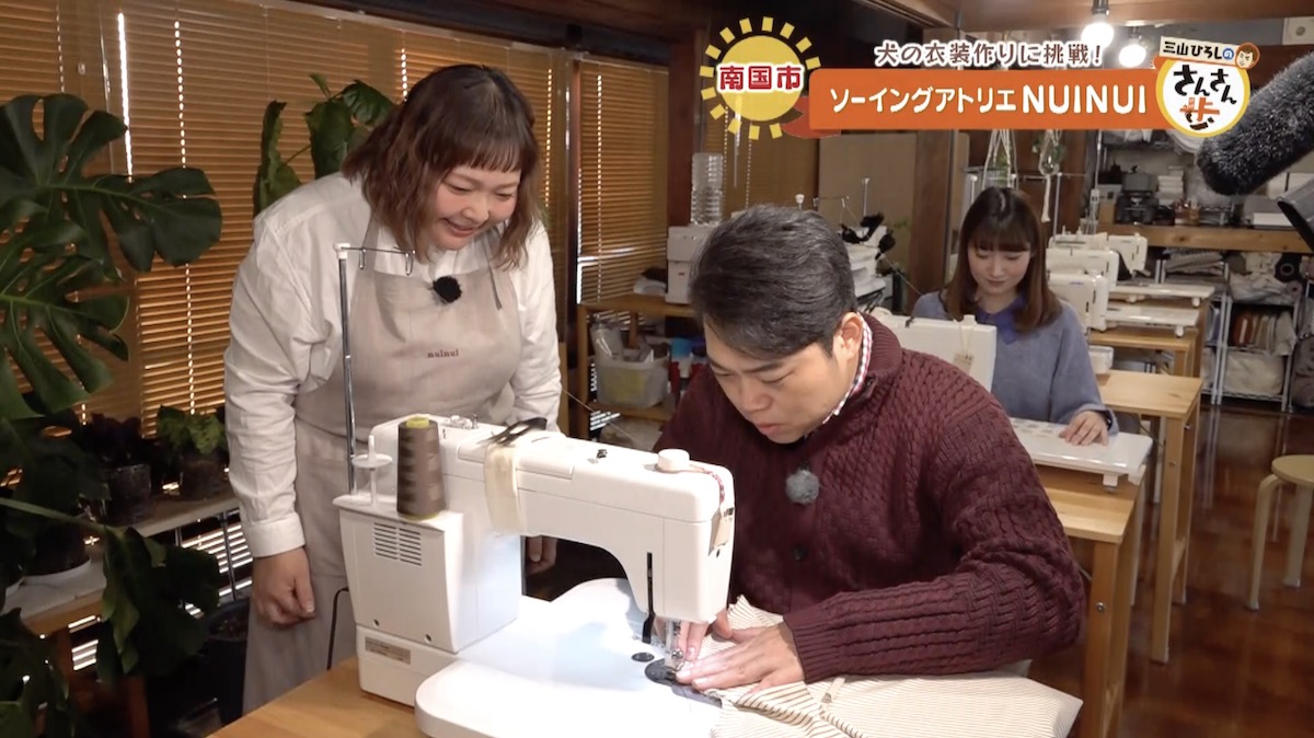 裁縫教室で実施されるカリキュラムを体験することになった三山さんと川辺アナ。