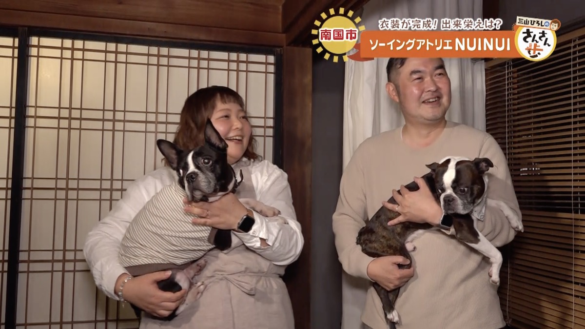 完成した衣装は尾本家の愛犬・ペペとプーに試着してもらった。