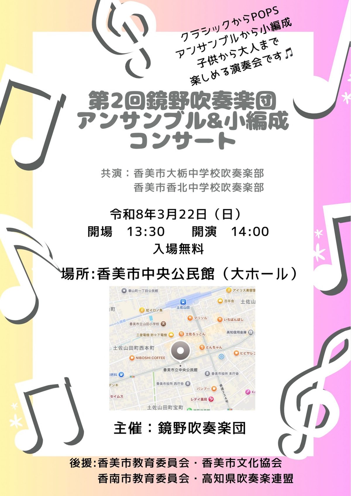 入場は無料。 現在吹奏楽を頑張っている中高生はもちろん、音楽が好きな方、地域を応援したい方、ぜひ香美市中央公民館へ足を運んでみませんか?