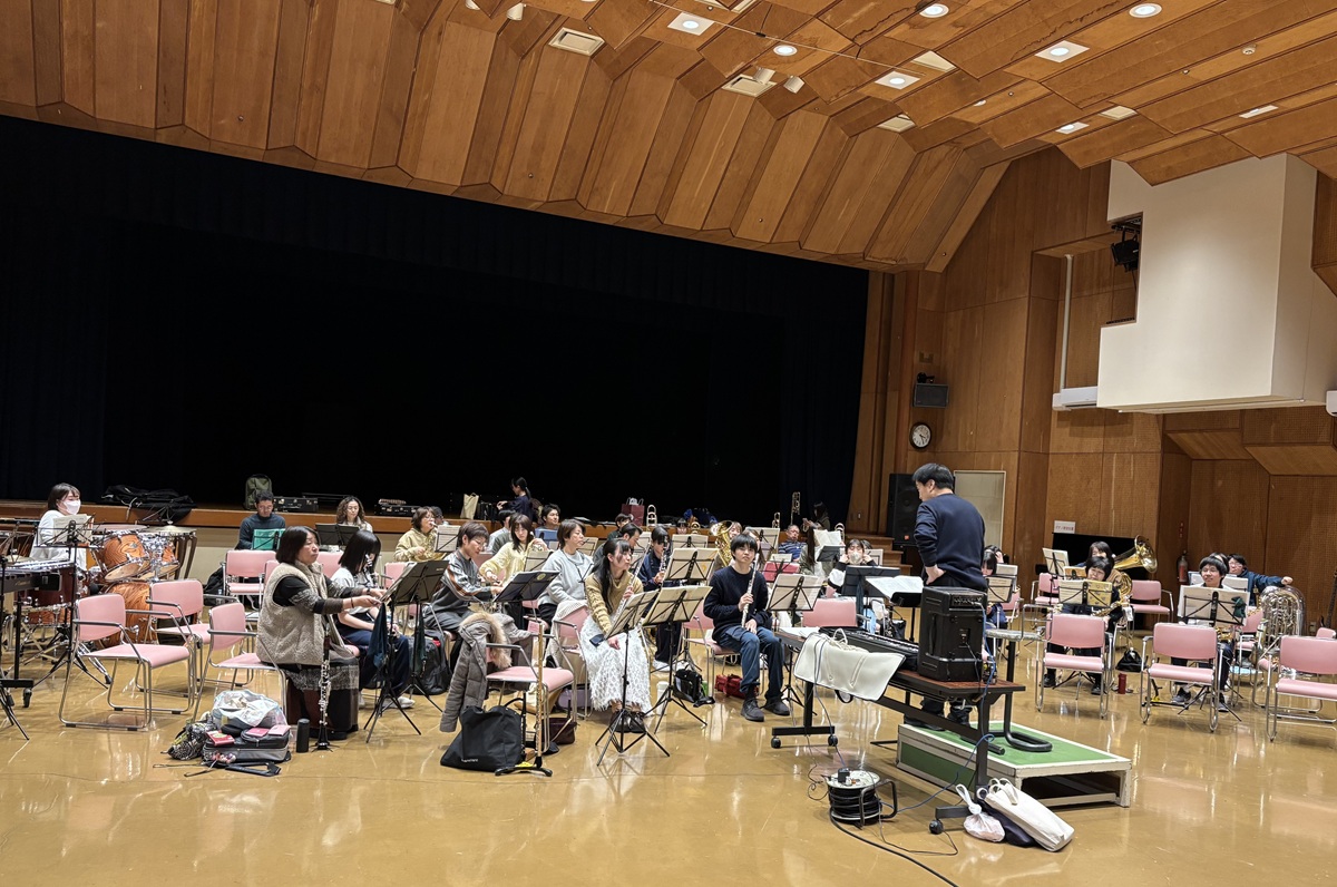 普段はアンサンブル(少人数合奏)がメインの生徒たちが、社会人楽団の中に入って一緒に演奏に挑みます。