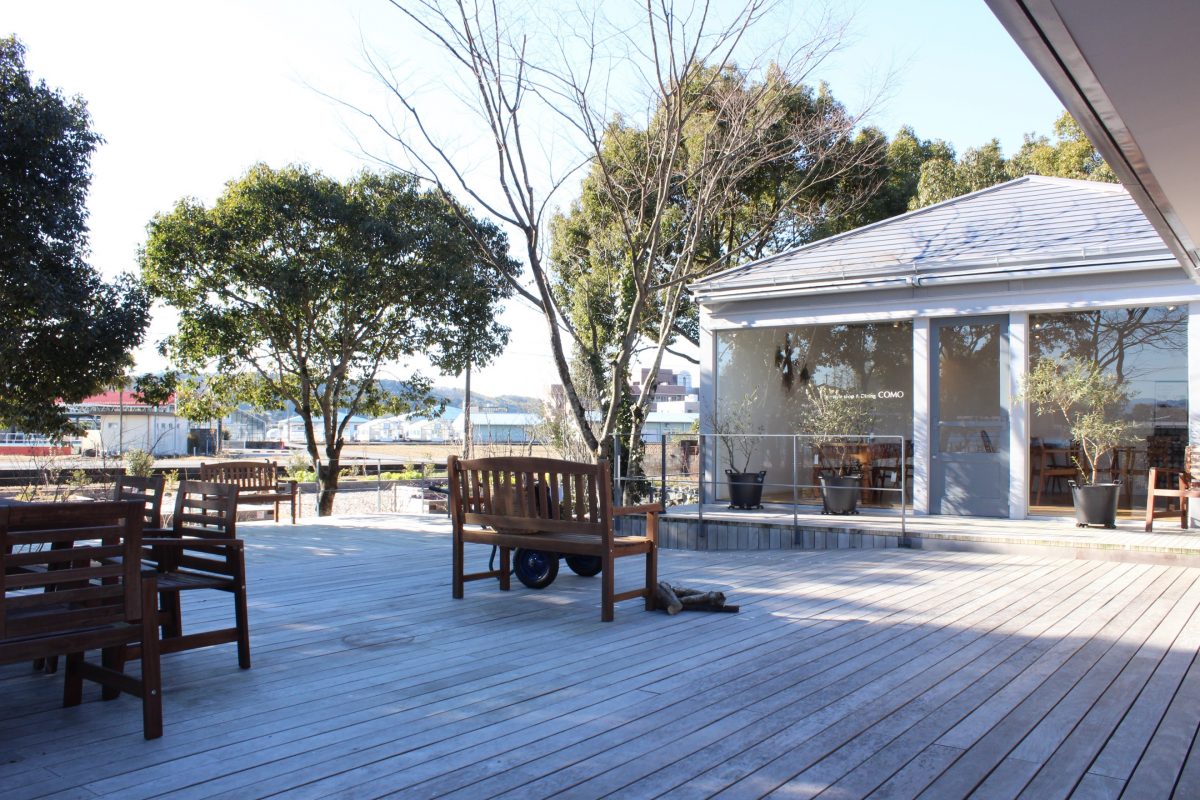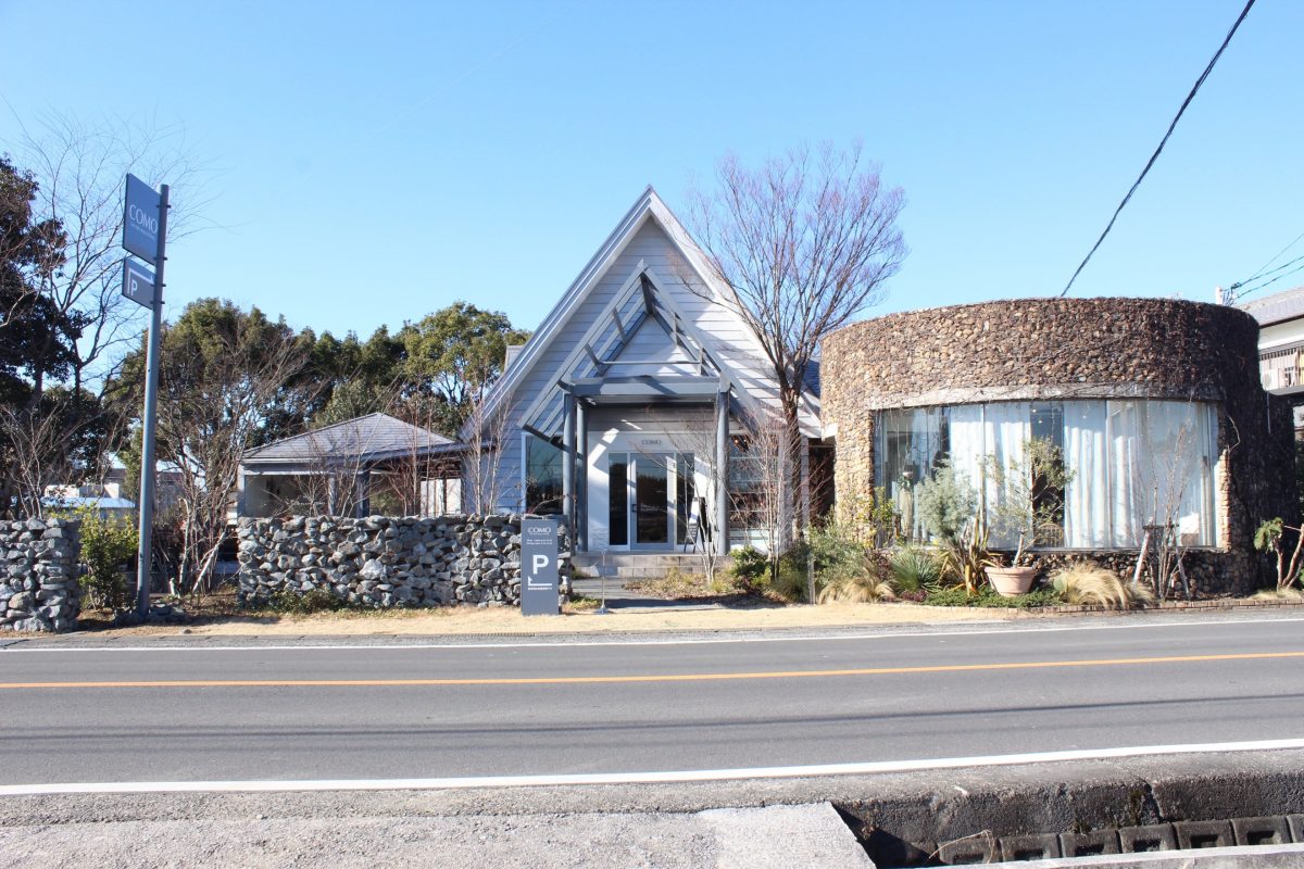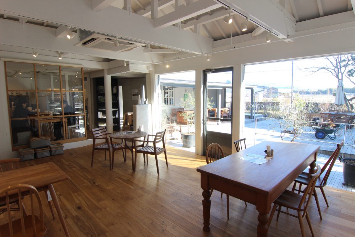 今回訪れたのは、高知市から車で約30分。南国市廿枝の周囲に田園が広がるのどかな場所にある、小さな森のようなお庭が目を惹くおしゃれなカフェ「COMO」。
