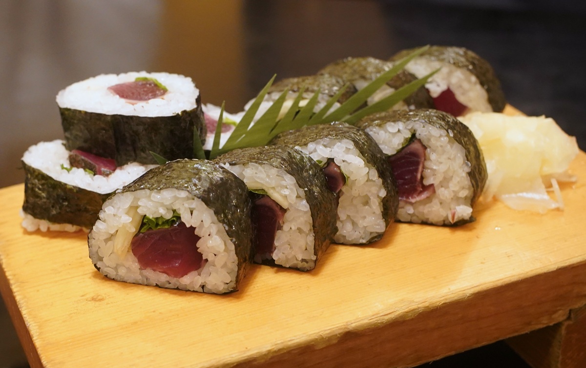 中央に巻かれた、カツオの深赤色が食欲を誘う。