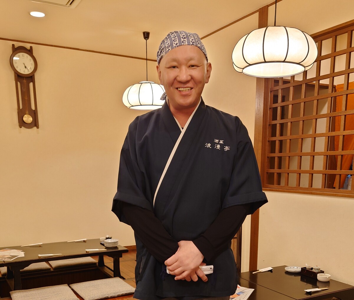 「酒菜 浪漫亭」と書かれた紺色の暖簾をくぐると、靴を預け、板張り掘り炬燵のテーブルに座る。