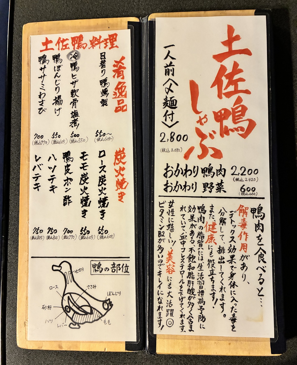 ここは、高知県(春野町・芸西村)の専用農場で、水素還元水と非遺伝子組み換え飼料で育てられたチェリバレー種の高品質な合鴨「土佐鴨」をいただくことができる、希少な店である。